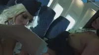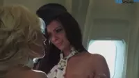 In the midst of a busy airplane cabin, two alluring stewardesses couldn't hide their undeniable attraction to each other any longer.As they exchanged flirtatious glances from across the plane, it was obvious that the tension between them was building rapidly.They decided to take advantage of their break in the galley kitchen, slipping away and locking the door behind them.Within moments, these flight attendants were all over each other, passionate French kisses sealing their desires.They quickly undressed themselves, revealing supple, shaved skin that was begging to be explored.As one stewardess caressed her lover's breasts with soft, sensual fingers, the other reached down below to play with her clit, causing waves of pleasure and anticipation to build up in her body.Their panting breaths intermingled as they eagerly ate each other out, licking their partner's wet pussy, teasing her sensitive labia and relishing the taste of the other's sweet nectar.They shared each other's womanhood with hunger, the intensity of their oral skills quickly leading them towards an earth-shattering climax.As if to complete this raunchy scene from a lesbian fantasy, they grabbed hold of their uniform skirts and raised them up, revealing the sexiness that lied beneath the regulation attire.Their panties followed suit, slipping down to reveal the perfect wet slits that would soon be fucked hard by each other.Without hesitation, one of the stewardesses began riding her partner's face as if it were an expertly made dildo.Her clit was being flicked at just the right angles, making the other girl cum like there's no tomorrow.In response to this, she reached back and grabbed the first woman's tits, pulling them into her eager mouth as she savored their taste and texture in the process.But that was only the start, as one stewardess then pulled out a small, discreet vibrator that she had tucked away for this moment, using it to pleasure both of their moist cunts until they were about to cum again.As if sensing the need to mix things up even more, they moved onto each other, one spreading her legs wide open and inviting her lover to eat her out some more while the other slipped on a condom before penetrating her with her own fingers.Soon enough, they were fucking each other like wild animals, grunting and moaning in lust, sweat dripping off their bodies as they sought to satisfy every sexual desire that was surging through them.They even used a small dildo at one point, thrusting it in and out of their cunts until they both had the most incredible climaxes of their lives.As their passion subsided, they collapsed against each other on the kitchen floor, still panting with exhilarated breaths.The uniform skirts, soiled from their messy fuck session, lay around them in a crumpled heap.They gazed into each other's eyes, basking in the afterglow of their unforgettable love-making experience as they whispered sweet nothings in one another's ears, promising to cherish the memory for as long as they live.And so, in the confines of the plane's kitchen, two flight attendants fulfilled their lust and passion for each other - a tale that will remain etched in their hearts and minds, a lesbian fantasy come true in the airiest of airplane cabins.